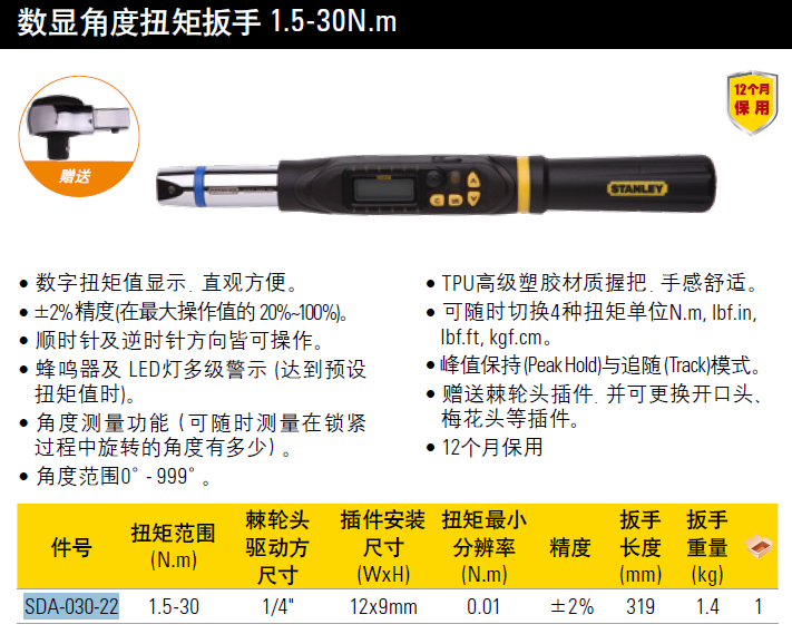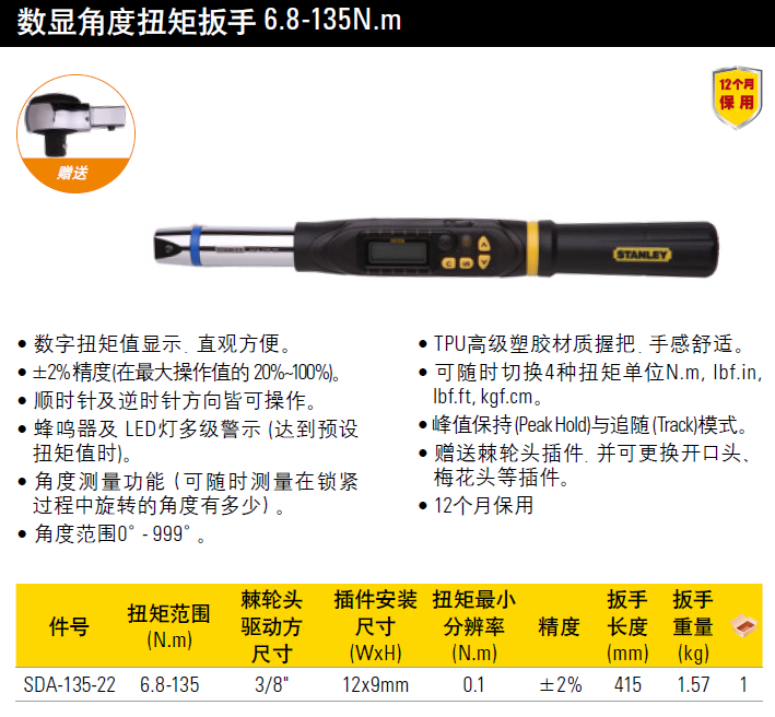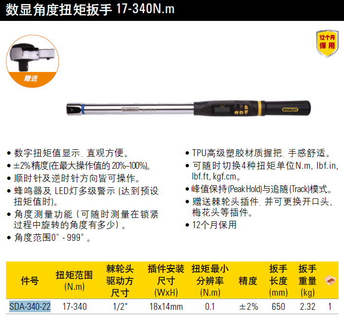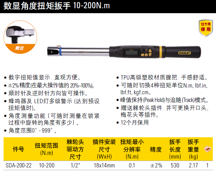 史丹利(Stanley)订制数显角度扭矩扳手 1.5-30N.m SDA-030-22/SDA-135-22/角度扭矩扳手 SDA-200-22/公斤扳手角度扭矩扳手SDA-340-22