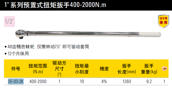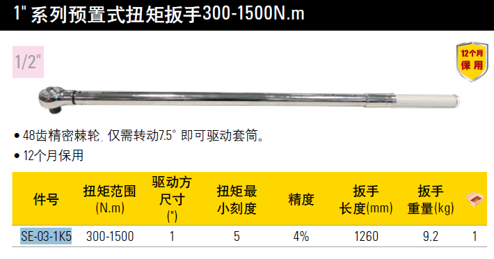 史丹利(STANLEY)1英寸系列预置式扭矩扳手公斤扭力棘轮快速力矩板手 SE-03-1K5 (300-1500N.m)现货/史丹利 预置式扭矩扳手400-2000N.m SE-03-2K