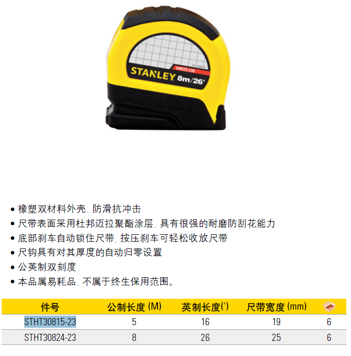 史丹利(Stanley)订制LeverLock公英制卷尺5m/16英尺 STHT30815-23