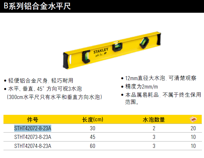 史丹利(STANLEY)B系列铝合金水平尺高精度水平尺装修平衡尺靠尺 STHT42072-8-23A(12英寸) 现货