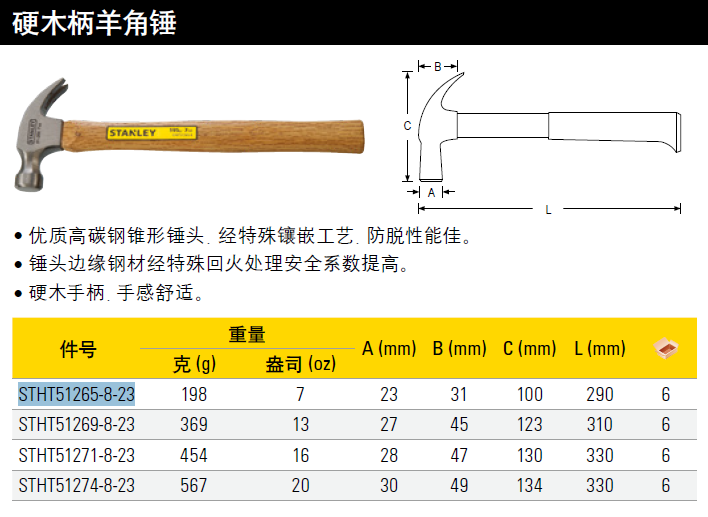 史丹利STANLEY 硬木柄羊角锤7oz家用小锤子 木工装修锤榔头 起钉锤拔钉 铁锤 榔头 STHT51265-8-23 企业专享