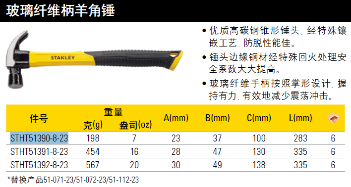 史丹利(STANLEY)玻璃纤维柄羊角锤起钉铁锤子装修钢柄榔头锤子安装锤 STHT51390-8-23 (7OZ)现货