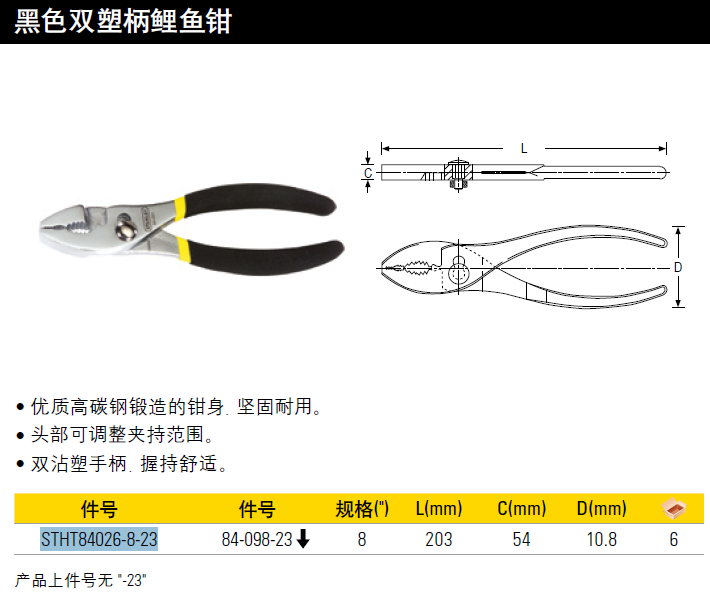 史丹利STANLEY DYNAGRIP鲤鱼钳8英寸活口钳子 鱼嘴钳 家用管子钳鱼尾钳 STHT84026-8-23 企业专享