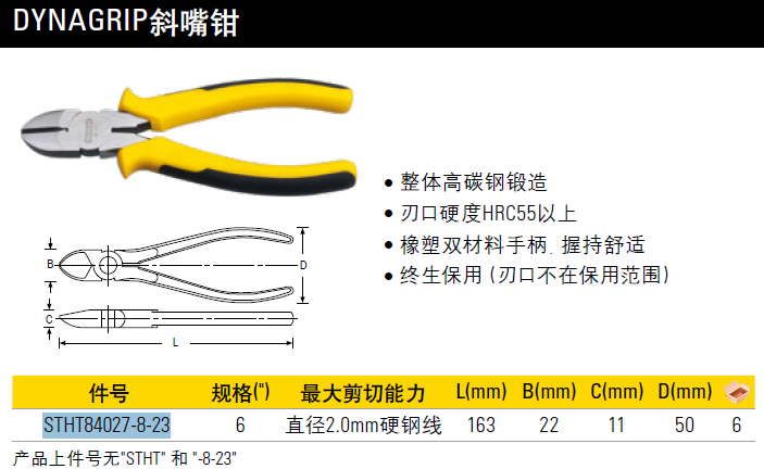 史丹利(STANLEY)DYNAGRIP斜嘴钳斜口钳电子剪线钳子6英寸 STHT84027-8-23