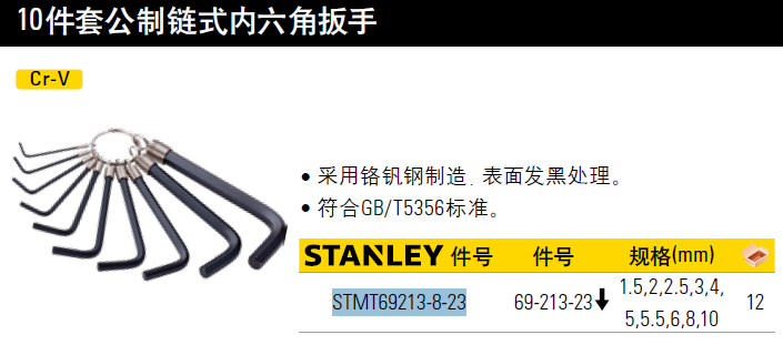 史丹利STANLEY 10件套公制链式内六角扳手1.5-10mm 套装梅花内6角内六方螺丝刀板手 STMT69213-8-23 可定制