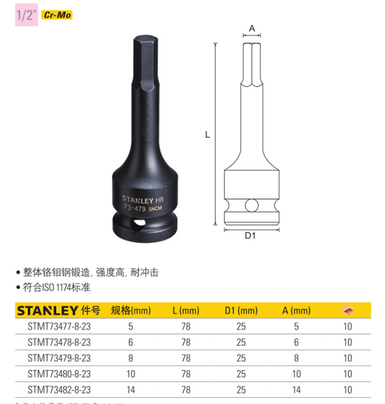 史丹利(stanley)2个装12.5MM系列6角风动旋具套筒H5工具STMT73477-8-23