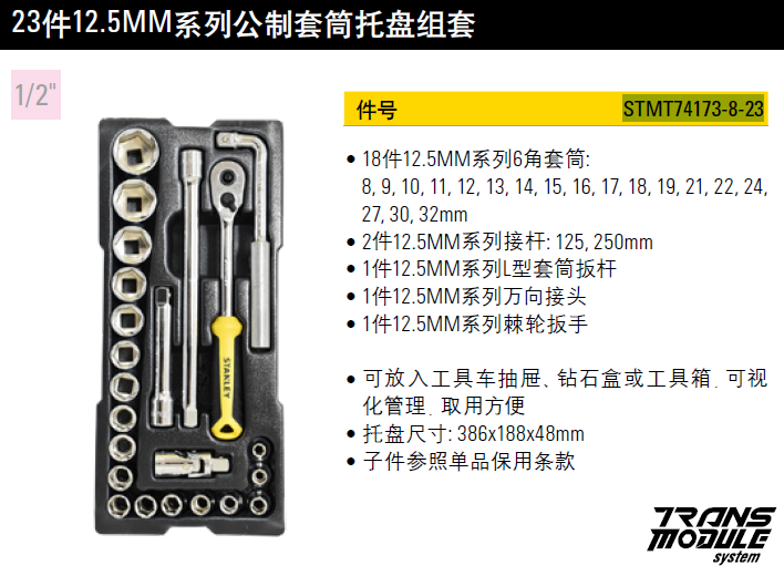 史丹利STANLEY 23件12.5mm系列公制套筒托盘组套 扳手套筒批头维修套装 STMT74173-8-23 企业定制