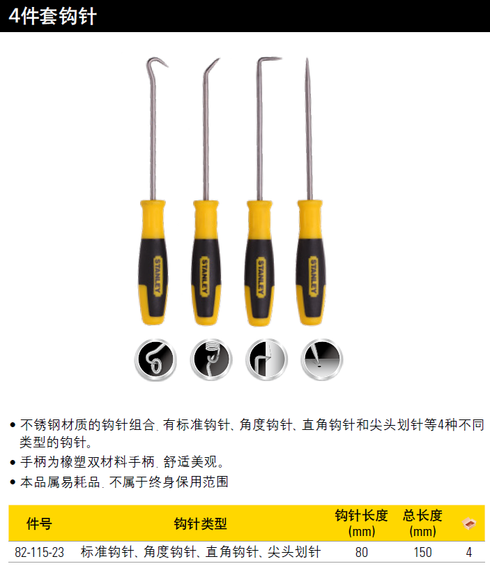 史丹利(STANLEY)4件套钩针勾针油封汽修工具 82-115-23