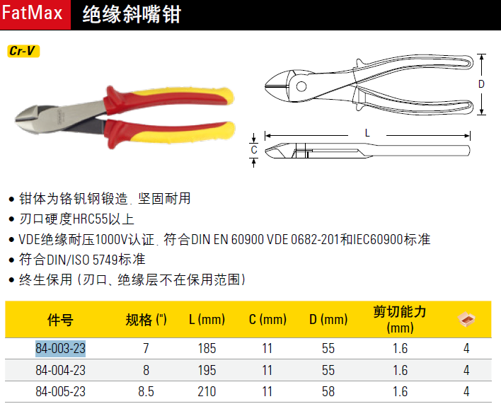 史丹利(STANLEY)FatMax绝缘斜嘴钳斜口钳电工钳7英寸 84-003-23