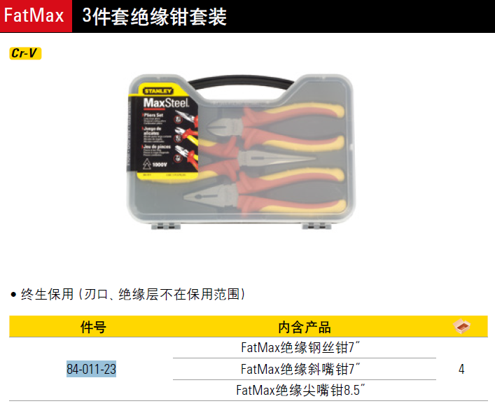 史丹利STANLEY 3件套Fatmax绝缘钳套装 钢丝尖嘴斜嘴钳老虎钳 84-011-23 企业定制