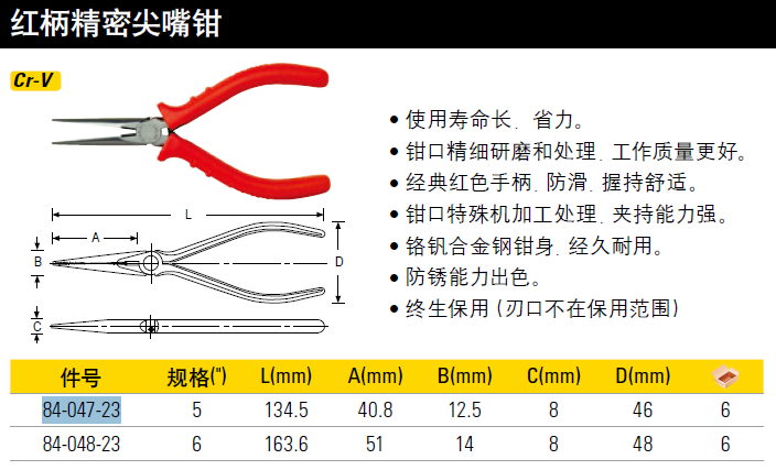 史丹利(Stanley)订制红柄精密尖嘴钳5英寸 84-047-23