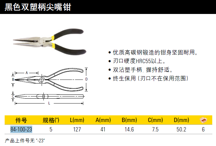 史丹利(STANLEY)黑色双塑柄尖嘴钳两用尖嘴钳尖口钳尖咀钳 84-100-23(5英寸)现货