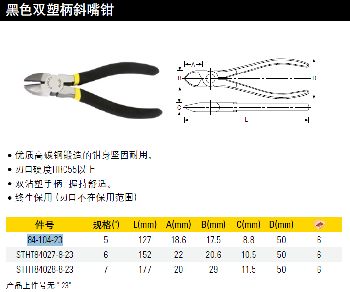 史丹利(STANLEY)黑色双塑柄斜嘴钳斜口钳钢丝钳剪钳偏嘴钳子剪线钳 84-104-23(5英寸)现货