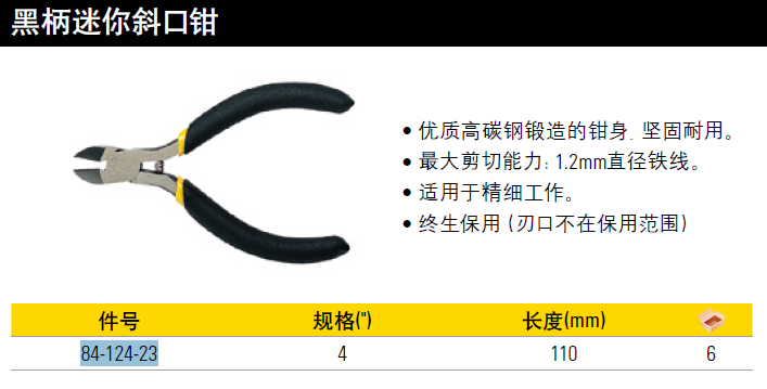 史丹利(Stanley)黑柄迷你斜嘴钳4英寸 84-124-23