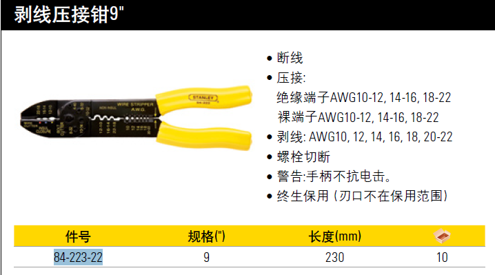 史丹利STANLEY 剥线压接钳9英寸 剪压线拨线钳电工工具剥皮钳子拔线刀 84-223-22 企业定制