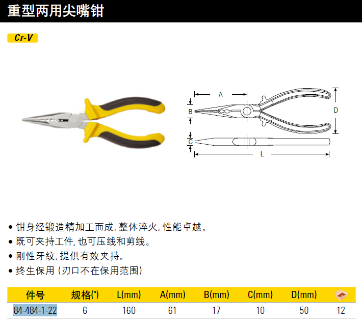 史丹利STANLEY 重型两用尖嘴钳6英寸 多功能尖头钳子尖咀手工小尖咀 84-484-1-22 企业定制