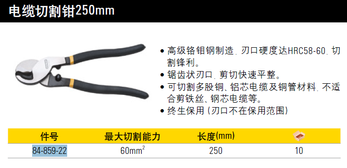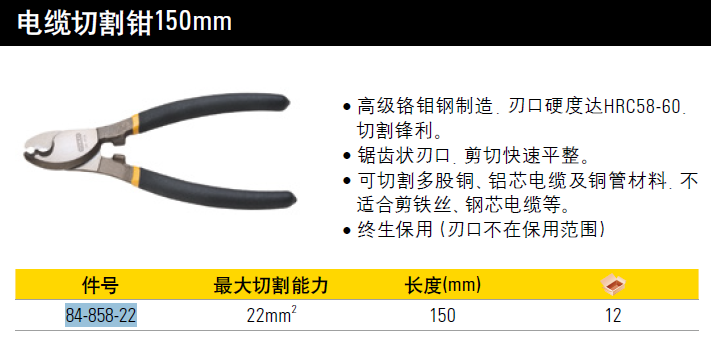 史丹利STANLEY 手动电缆钳150mm(0-22mm2) 电缆电线钳电工切线断线钳 84-858-22 企业定制