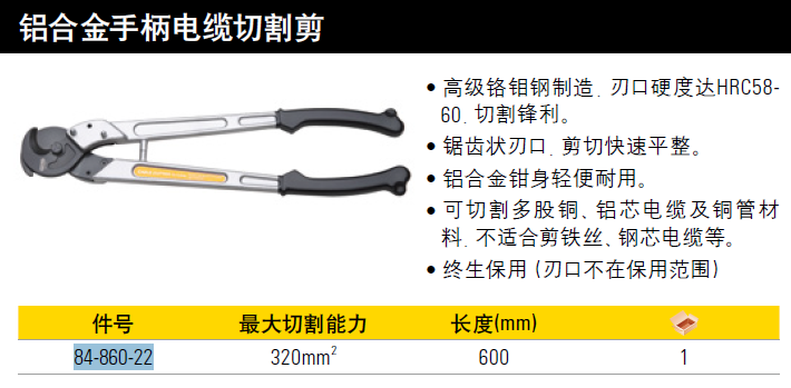 史丹利STANLEY 铝合金手柄电缆切割钳0-325mm2 电缆电线钳电工切线断线钳 84-860-22 企业定制