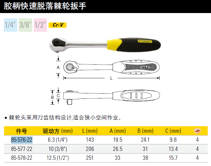 史丹利(Stanley)订制胶柄快速脱落棘轮扳手85-576-22(付款后5-10天发货)