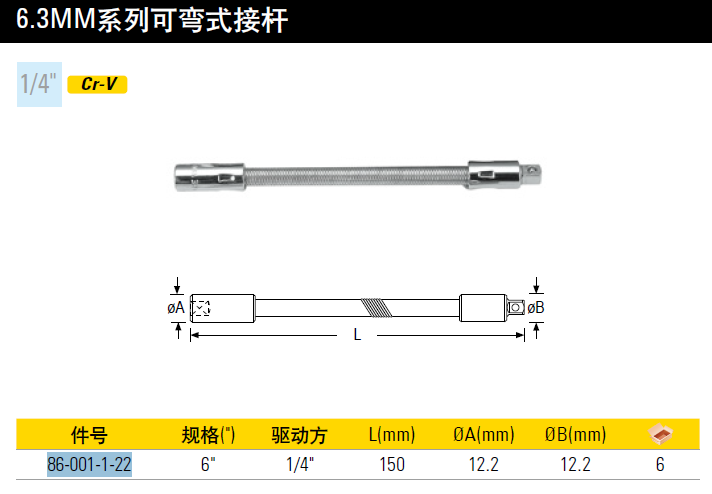 史丹利(Stanley)1\/4套筒转接头接杆 6.3mm系列小飞棘轮扳手套筒延长杆 柔性可弯接杆(150mm长)86-001-1-22