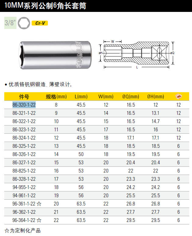 史丹利公制6角长套筒10MM系列内六角套筒8mm3个装86-320-1-22