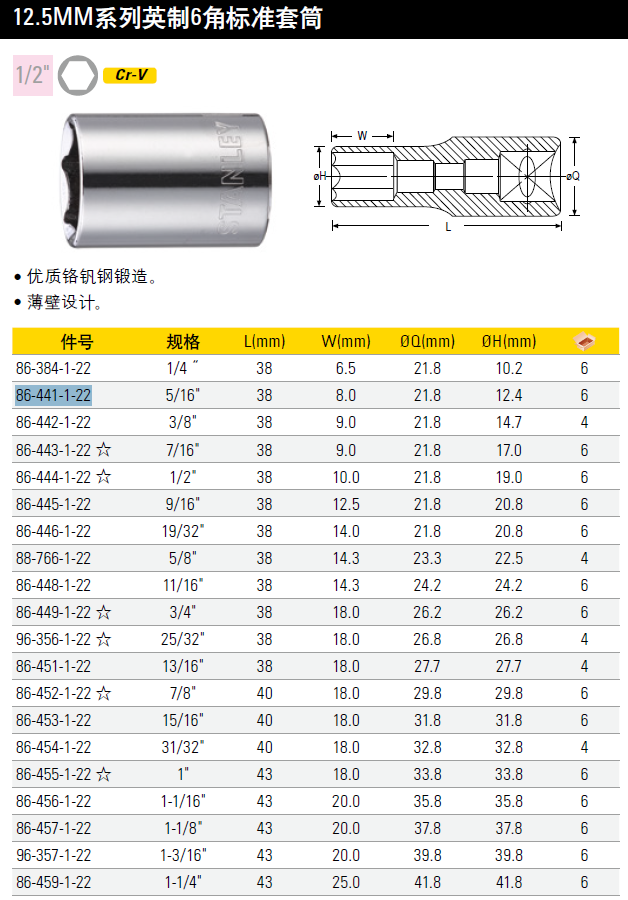 史丹利(STANLEY)86-441-1-22 12.5MM系列英制6角标准套筒5/16"*10个/盒 铬钒钢 现货