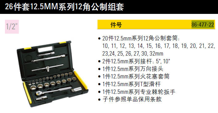 史丹利(STANLEY)26件12.5MM系列十二角公制组套专业机修汽修扳手套筒 86-477-22 现货