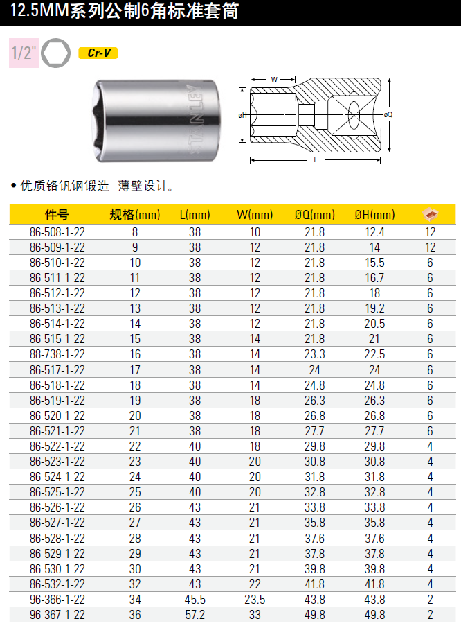 史丹利(Stanley)1/2英寸12.5mm系列6角套筒头汽修大飞快速棘轮扳手套筒 8MM 86-508-1-22