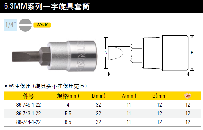 史丹利(STANLEY)6.3mm系列一字旋具套筒汽修机修棘轮扳手小飞套筒 86-743-1-22 (5mm)现货