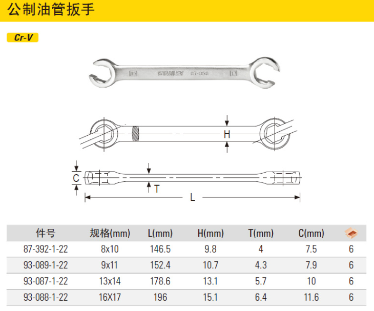 史丹利(STANLEY)公制油管扳手六角呆头开口扳手双头卡口油管扳子 87-392-1-22 (8x10mm)现货