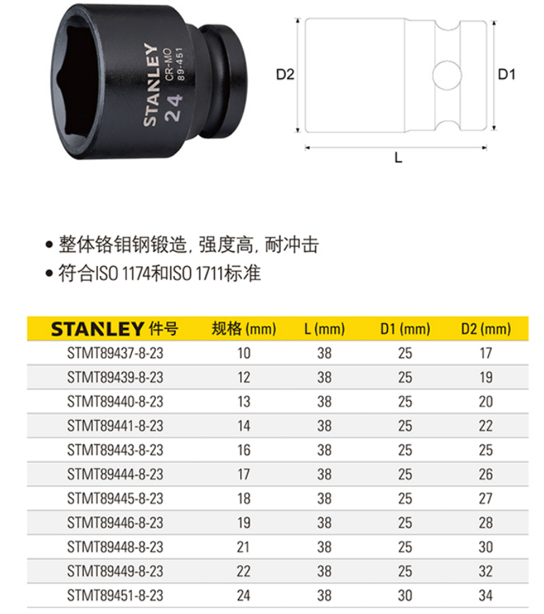 史丹利(STANLEY)12.5mm系列公制六角风动长套筒汽修机修棘轮扳手大飞套筒 87-502-1-22 (15mm)现货
