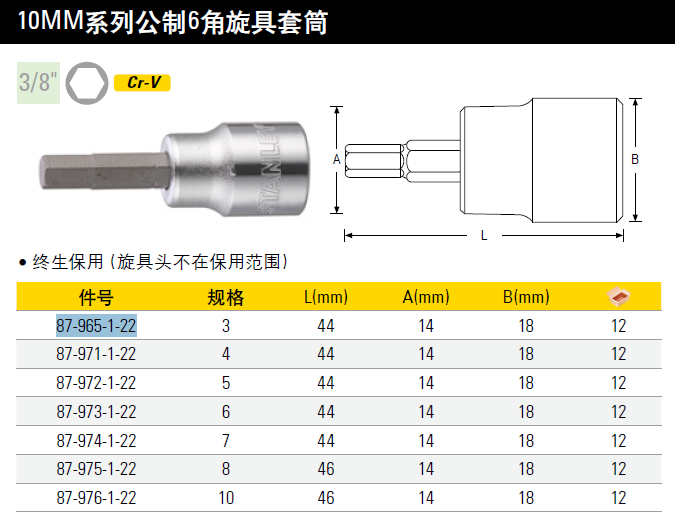 史丹利(STANLEY)10mm系列6角旋具套筒汽修机修棘轮扳手中飞套筒 87-965-1-22 (3mm) 87-965