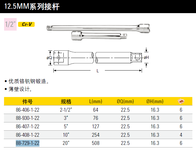 史丹利(Stanley)12.5mm系列大飞棘轮扳手延长杆 套筒转接头 接杆 加长杆(508mm长)88-729-1-22