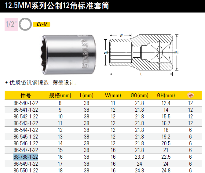 史丹利(Stanley)1/2英寸大飞棘轮扳手套筒 薄壁12角套筒头 16mm 88-788-1-22