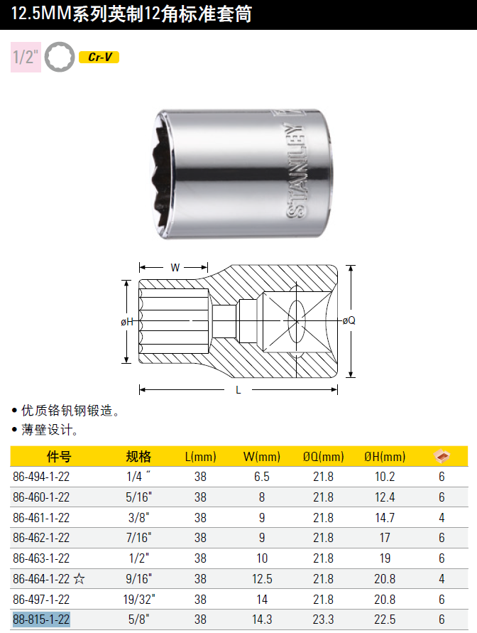 史丹利 STANLEY 订制12.5MM系列英制12角标准套筒5/8(5个装)88-815-1-22(付款后5-10天发货)