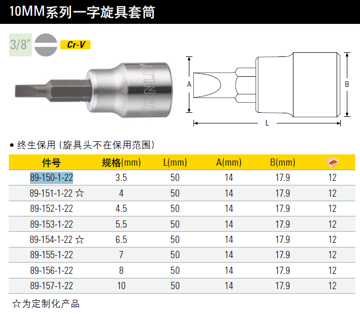 史丹利(Stanley)旋具套筒 10MM系列中飞快速扳手旋具头 套筒批头 一字3.5MM 89-150-1-22