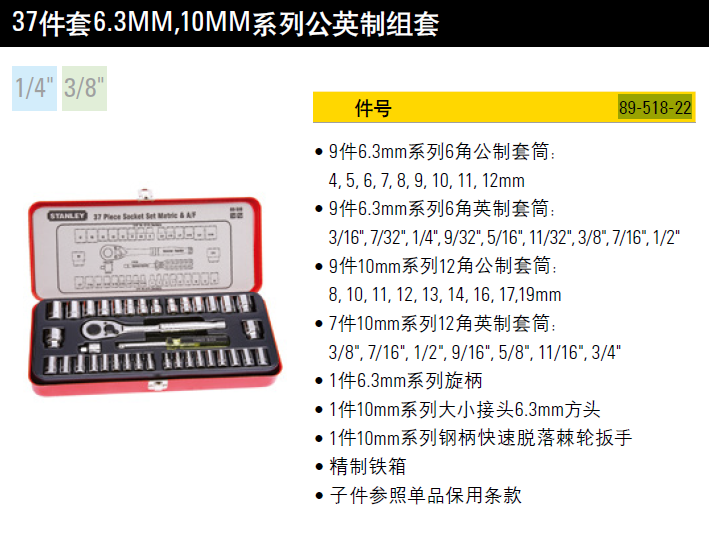 史丹利37件6.3+10M系列公英制综合工具箱套装小飞中飞套筒扳手 89-518-22汽修工具组套