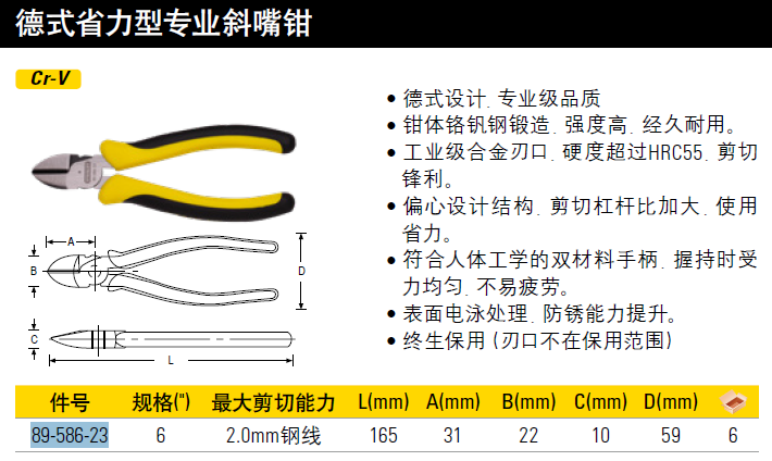 史丹利(STANLEY)德式省力斜嘴钳 工业级斜口钳子 剪切钳 电工钳6英寸 89-586-23