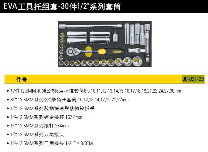 史丹利(STANLEY)30件套1/2英寸系列六角棘轮套筒扳手EVA工具托套装 90-031-23 现货