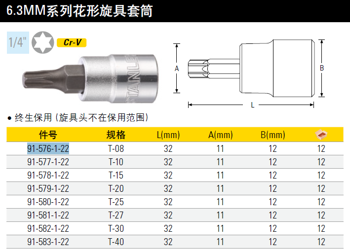 史丹利(Stanley)6.3MM系列小飞棘轮扳手套筒批头 压批旋具套筒 六角梅花型T8 91-576-1-22
