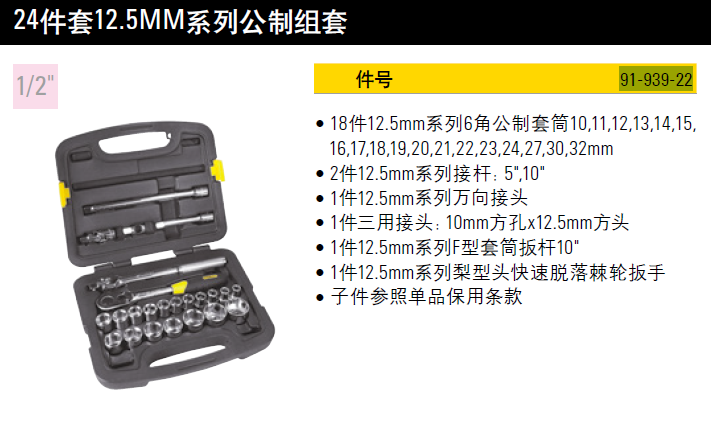 史丹利STANLEY 24件套12.5mm系列公制组套 棘轮扳手套筒接杆汽修工具 91-939-22 企业定制
