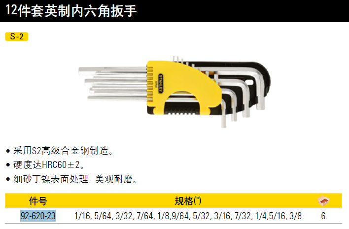 史丹利(STANLEY)12件套内六角扳手 英制 加长平头L形螺丝刀 内六方扳手1/16-3/8 92-620-23