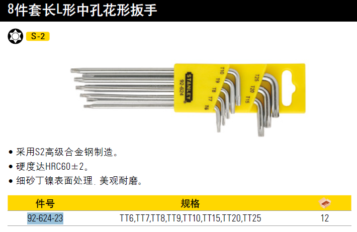史丹利STANLEY 8件套长L形中孔花形扳手TT6-TT25 梅花内六角扳手六角空心 92-624-23 企业定制