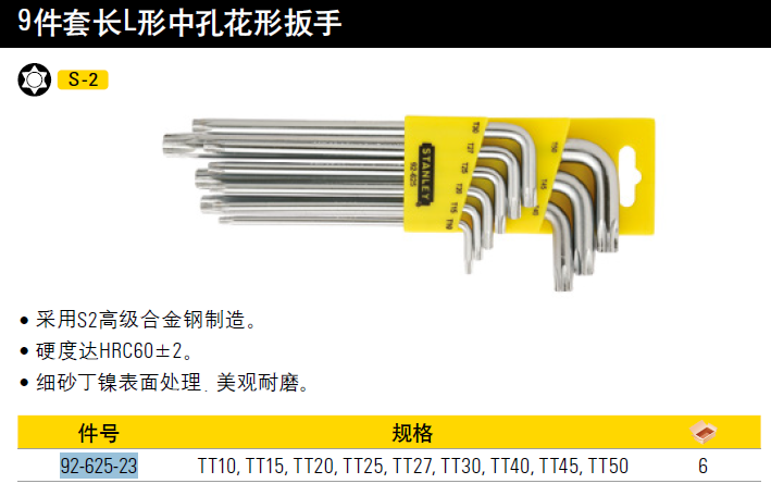 史丹利STANLEY 9件套长L形中孔花形扳手TT10-TT50 梅花内六角扳手六角空心 92-625-23 企业定制