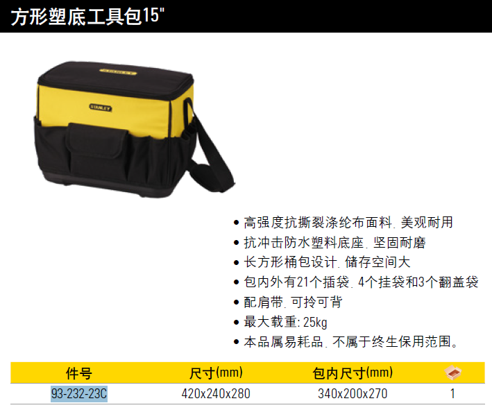史丹利STANLEY 方形塑底工具包15英寸 工具提包单肩包 93-232-23C 企业定制