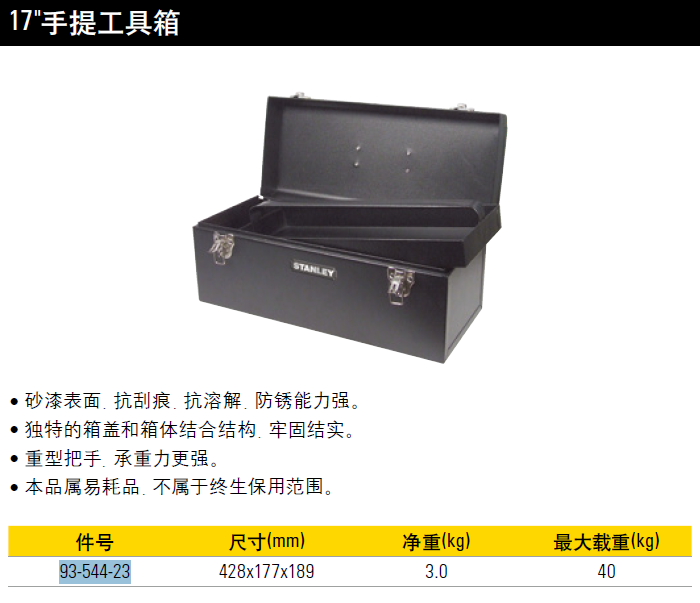 史丹利STANLEY 手提工具箱17英寸 铁皮工具箱钢制黑色手提收纳箱多功能家用工具盒车载箱 93-544-23 可定制