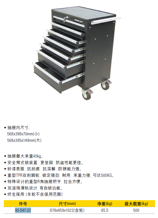 史丹利STANLEY 7抽屉带轮工具车680*458*860mm 推车移动汽修抽屉多功能汽车美容维修工具柜 93-547-23 可定制