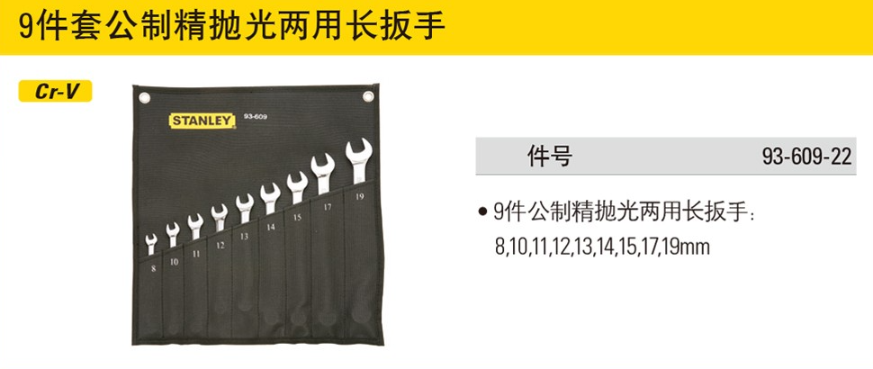 史丹利(Stanley)梅花开口两用扳手套装 精抛光9件套(8-19mm)93-609-22