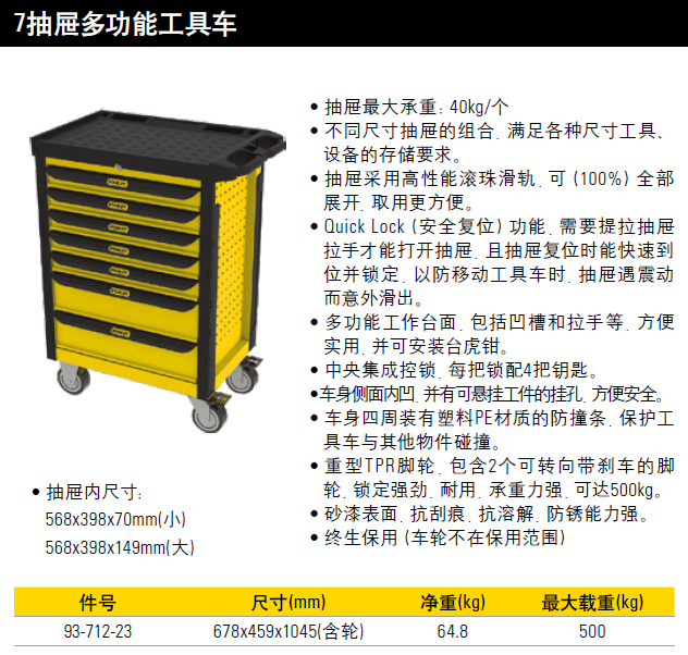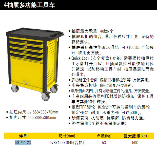 史丹利 4抽屉多功能工具车678x459*1045mm 推车移动汽修抽屉多功能汽车美容维修工具柜 93-711-23 可定制