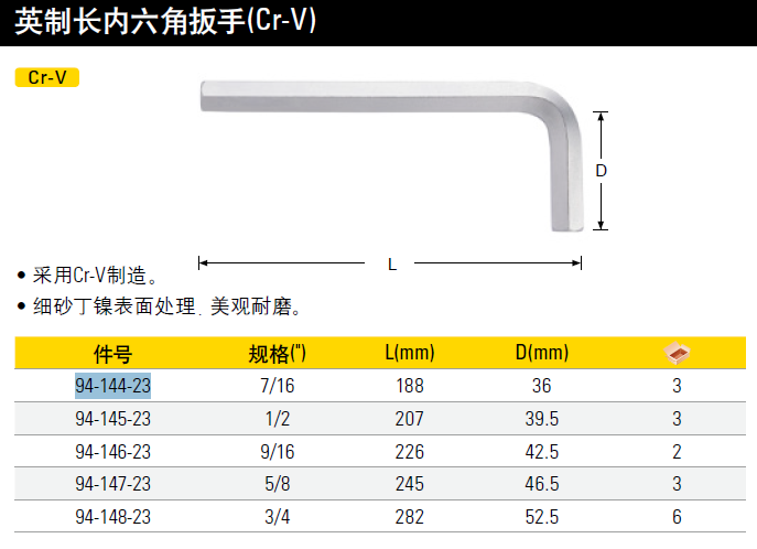 史丹利(STANLEY)英制长内六角扳手六棱内六方螺丝刀L型扳手 94-144-23 (7/16英寸)现货